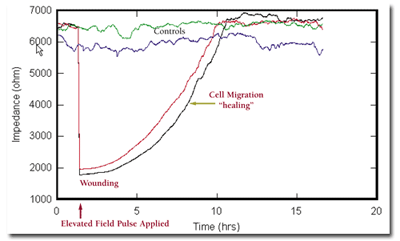 典型的損傷修復(fù)實(shí)驗(yàn)如下圖所示。BSC1細(xì)胞首先長(zhǎng)成單細(xì)胞層,然后兩個(gè)孔中給予點(diǎn)擊,使測(cè)量電極上的細(xì)胞死亡,引起阻抗值降低。隨時(shí)間的延長(zhǎng)這兩個(gè)曲線又回到初始數(shù)值,這是由于那些在電極外的正常細(xì)胞向損傷地區(qū)遷移并重新生長(zhǎng)并且替換已死去細(xì)胞。