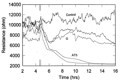 上圖分別是加入G細(xì)胞、AT3細(xì)胞和對(duì)照的內(nèi)皮細(xì)胞層阻抗曲線。可以看到隨著腫瘤細(xì)胞的加入,內(nèi)皮細(xì)胞層阻抗值開(kāi)始降低,并且AT3細(xì)胞引起的降低更加顯著,阻抗值降低的原因是由腫瘤細(xì)胞的侵入影響了完整的內(nèi)皮細(xì)胞層。